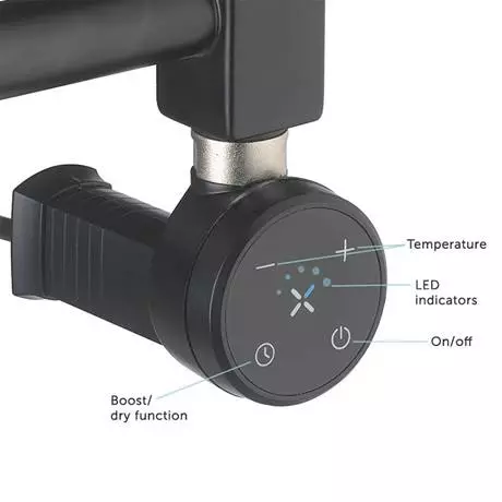 - Illuminated LED indicators display the set temperature level and the status of the heating