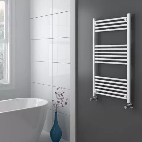 A quality modern 22mm tube diameter standard 600mm wide towel rail with a straight profile, finished in a classic brilliant ice white finish this luxury stylish towel rail brings a real quality finish to your bathroom. Comes with a 5 year guarantee against manufacturing defects.