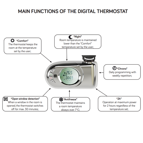 Towel rail comes with a chrome finish digital thermostat featuring five operational modes: